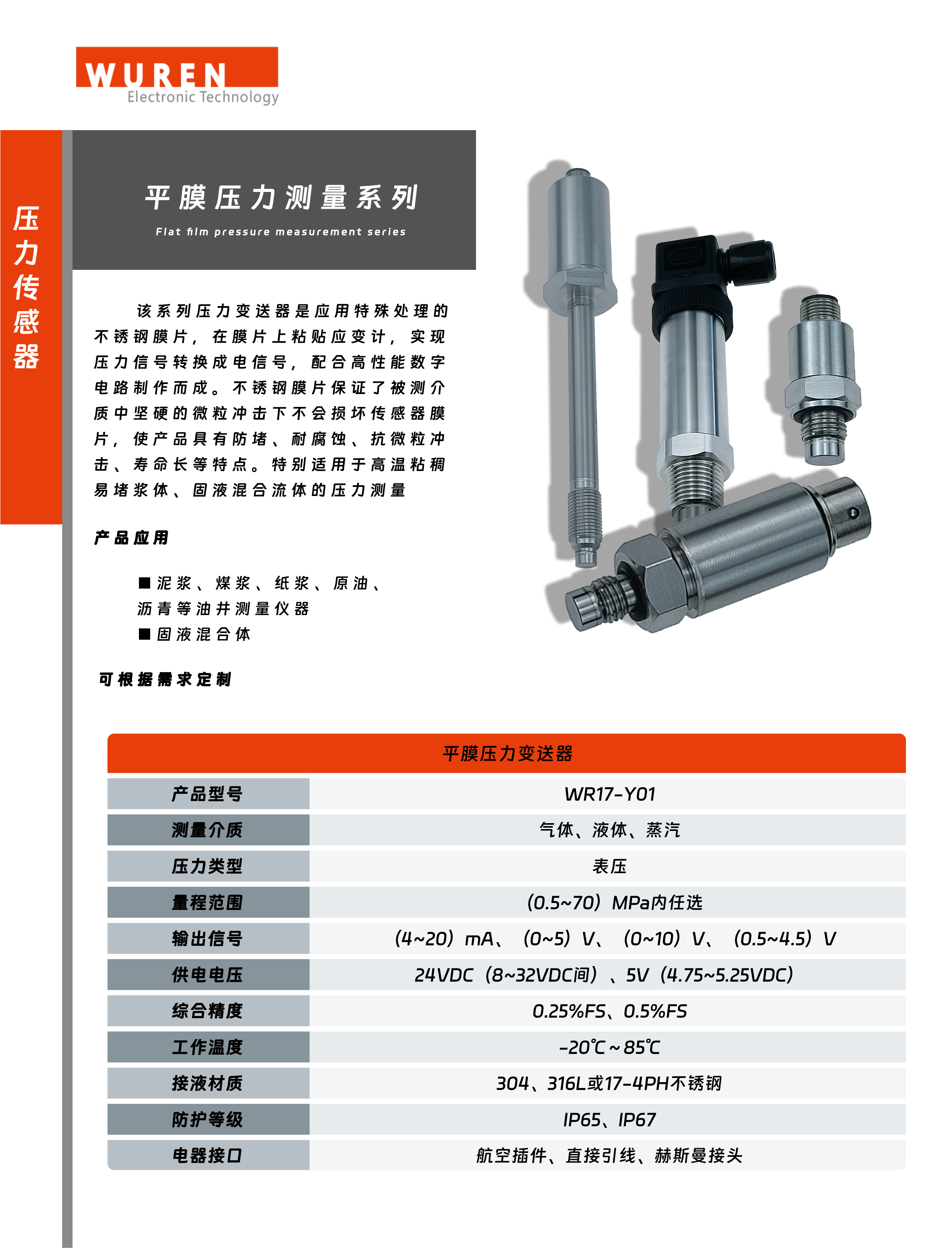 该系列压力变送器是应用特殊处理的不锈钢膜片,在膜片上粘贴应变计,实现压力信号转换成电信号,配合高性能数字电路制作而成。不锈钢膜片保证了被测介质中坚硬的微粒冲击下不会损坏传感器膜片,使产品具有防堵、耐腐蚀、抗微粒冲击、寿命长等特点。特别适用于高温粘稠易堵浆体、固液混合流体的压力测量